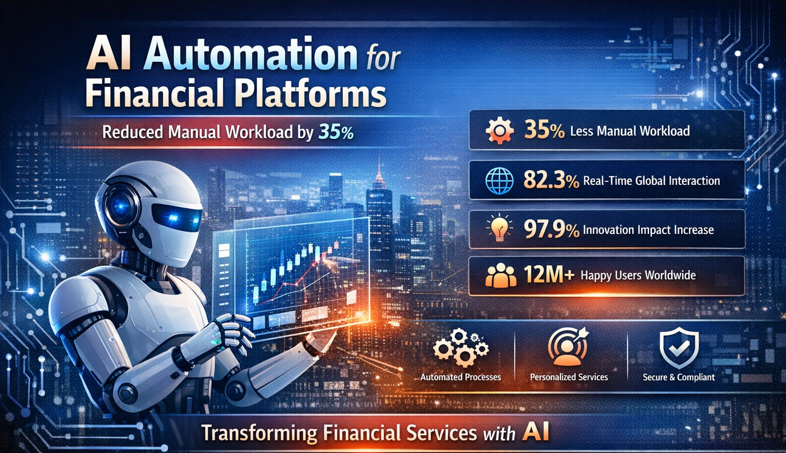 AI automates core and supporting tasks including data entry, reconciliation, customer queries, KYC verification, and report generation. By handling these repetitive processes, financial platforms can reduce manual workload by up to 35%, freeing employees for higher-value work and improving overall efficiency.